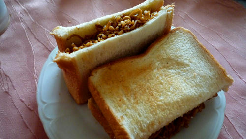 きんちゃん焼きそばをチーズとマヨネーズとで挟んだだけ。