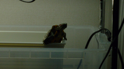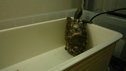 うちのアカミミガメ、甲羅がカビで白くなっている。